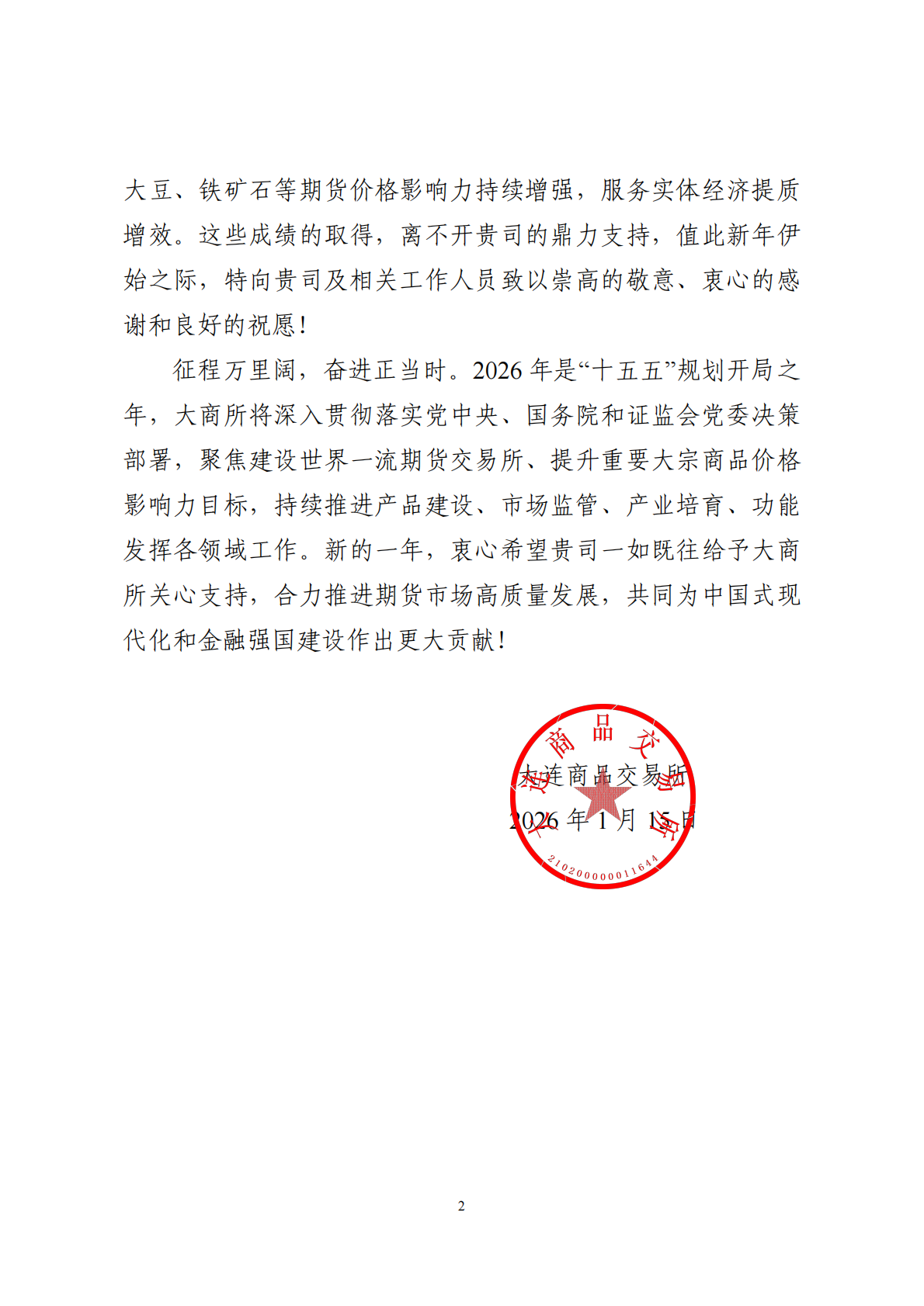 1月15日,蘇豪中錦公司收到大連商品交易所發(fā)來的感謝信,對(duì)中錦公司長期以來給予的支持與配合表示感謝,并對(duì)公司在2025年期貨市場(chǎng)建設(shè)與產(chǎn)業(yè)發(fā)展中作出的貢獻(xiàn)給予充分肯定。