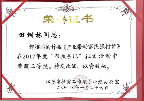 兩年來,田樹林同志除獲上述榮譽(yù)稱號(hào)以外,還獲宿遷市委市政府授予的“優(yōu)秀幫扶工作隊(duì)員(第一書記)”稱號(hào),并在省扶貧辦舉辦的“幫扶手記”征文比賽中獲榮三等獎(jiǎng),為中錦公司和匯鴻集團(tuán)增了光添了彩。