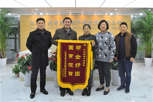 12月4日,江蘇南自通華智慧能源股份有限公司湯文尤副總經(jīng)理一行專(zhuān)程赴匯鴻中錦公司贈(zèng)送“幫企紓困 國(guó)企擔(dān)當(dāng)”錦旗一面,感謝匯鴻中錦公司今年在新冠肺炎疫情期間為該公司減免租金。