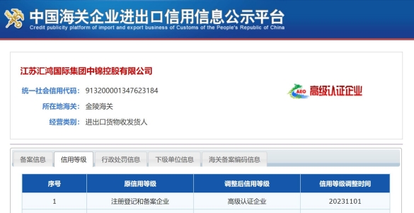 11月1日,中國海關(guān)企業(yè)進(jìn)出口信用信息公示平臺顯示,匯鴻中錦公司的信用等級調(diào)整為“高級認(rèn)證企業(yè)”,這標(biāo)志著公司被正式納入海關(guān)高級認(rèn)證管理體系,成為AEO高級認(rèn)證的進(jìn)出口貨物收發(fā)貨人之一。