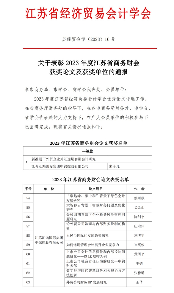 近日,由江蘇省經(jīng)濟(jì)貿(mào)易會(huì)計(jì)學(xué)會(huì)舉辦的2023年度江蘇省商務(wù)財(cái)會(huì)優(yōu)秀論文評(píng)選活動(dòng)落下帷幕。匯鴻中錦公司朱菲凡論文《新準(zhǔn)則下外貿(mào)企業(yè)外匯遠(yuǎn)期套期會(huì)計(jì)研究》獲得一等獎(jiǎng),另有公司多名青年員工的論文獲得通報(bào)表彰。