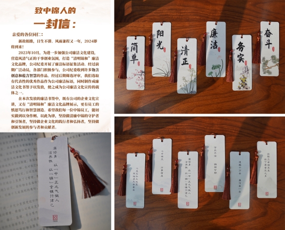 今年10月,公司紀委經(jīng)過前期深入發(fā)動,在公司范圍內舉辦廉潔標語征集活動。公司廣大干部職工熱情響應,積極參與,創(chuàng)造出很多飽含創(chuàng)意和蘊含智慧的作品。經(jīng)過認真評選,部分優(yōu)秀作品脫穎而出,成為具有中錦特色的廉潔標語。同時,我們選出有代表性的部分作品,融入書簽設計元素,制作成廉潔文化書簽在全公司范圍內予以發(fā)放。通過本次活動的開展,加深了公司員工們對廉潔文化的理解,激發(fā)了大家積極參與廉潔文化建設的熱情,營造出“人人思廉、人人倡廉、人人行廉”的濃厚氛圍。
