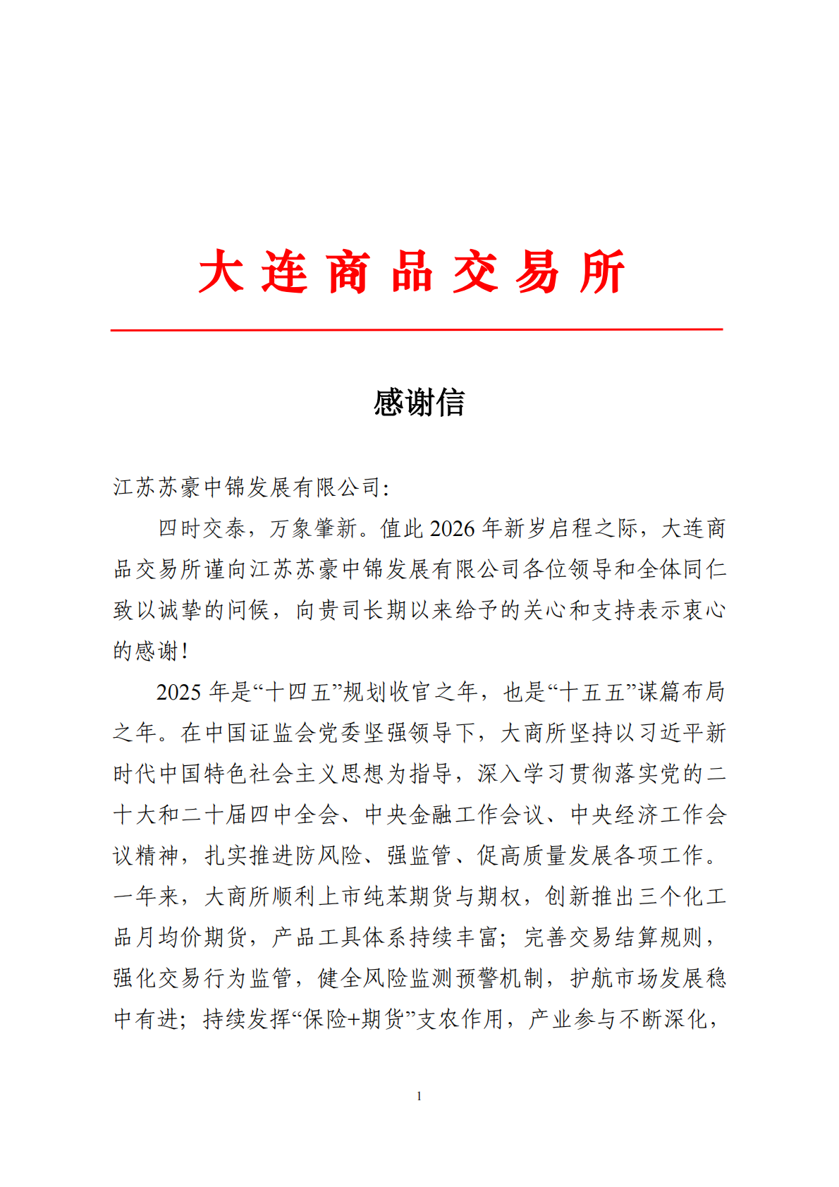 1月15日,蘇豪中錦公司收到大連商品交易所發(fā)來的感謝信,對(duì)中錦公司長(zhǎng)期以來給予的支持與配合表示感謝,并對(duì)公司在2025年期貨市場(chǎng)建設(shè)與產(chǎn)業(yè)發(fā)展中作出的貢獻(xiàn)給予充分肯定。